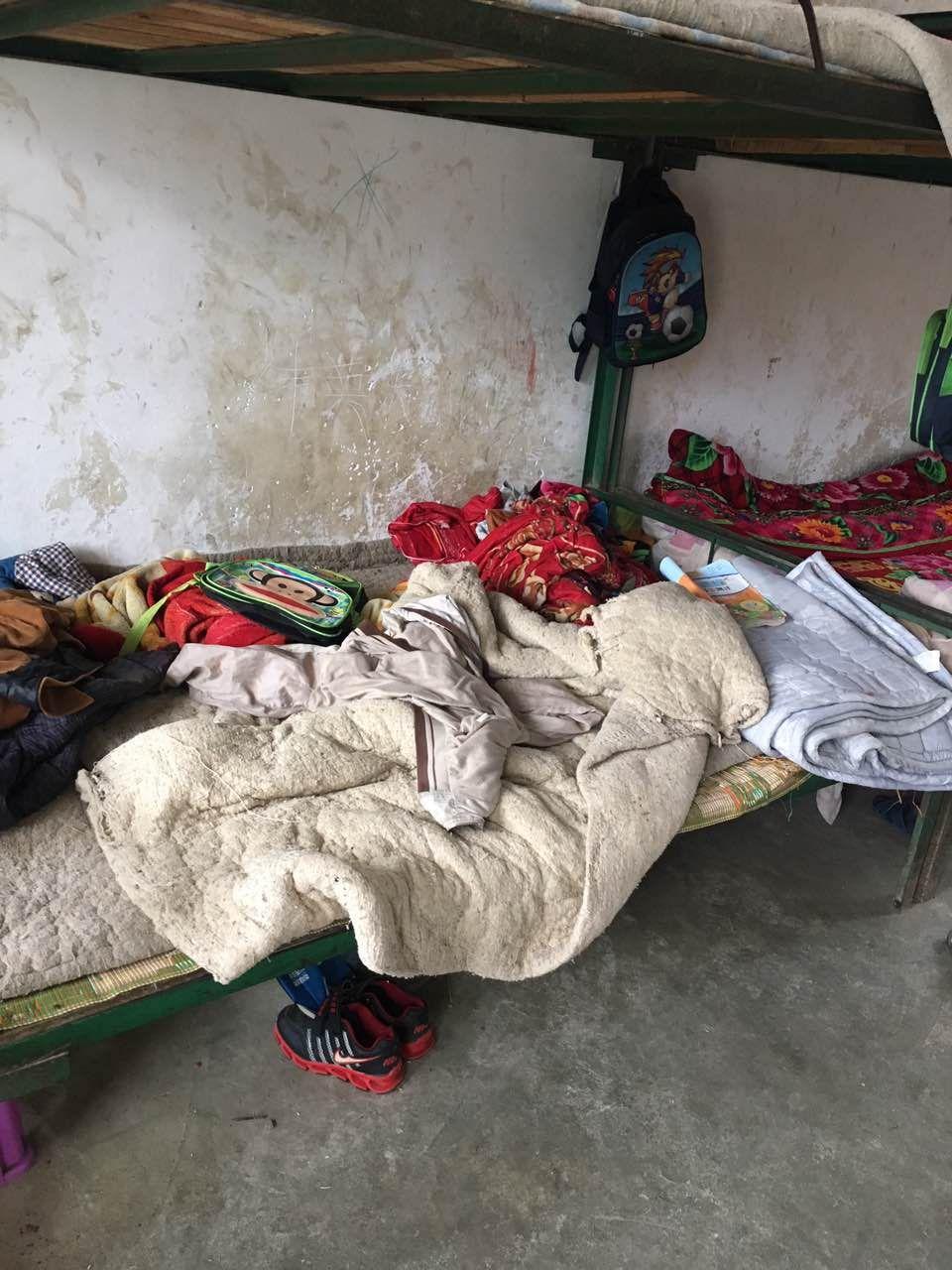 来到他们宿舍,可以看到几张铁床,分上下层,有些挂着蚊帐有些没有,这么冷的天气,有些床上还没有床垫,有些有了也比较薄,棉被有些还没有被套,棉花来做的被子也被睡得有点暗黑,冬天他们就是这样度过的,不像城市的孩子,有五颜六色的棉被,冷了还可以开暖气空调,相比之下,城里的孩子还是比较幸福的。