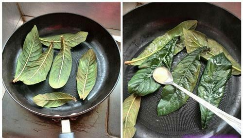 2、晒干水分,在平底锅上干焙,边焙边在叶面上涂蜂蜜。也可以直接加冰糖和水一起煮.