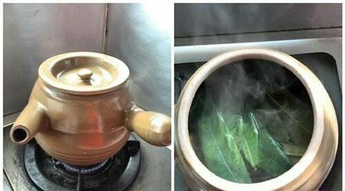 4、用容器热好水,水温热些就可以把枇杷叶放入,开大火到水开,再用小火熬一段时间就OK了。