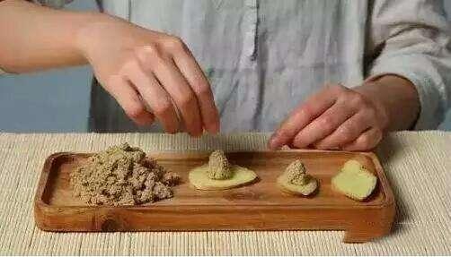 隔姜艾灸:取生姜一块,切成厚约0.3厘米厚的姜片,或一元钱硬币的厚度。大小根据膝盖面积、选用艾炷的大小而定,中间用牙签穿刺数孔。将生姜块放在膝盖上,点燃艾灸条。以膝盖皮肤潮红为度。
