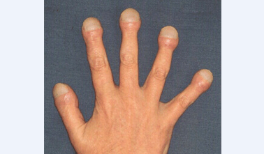 表现为指末节肥大,状如鼓槌;指甲增大,呈圆形凸面。常见于慢性肺部疾病、心脏病、肝硬化等疾病。治疗原则是及早查明、治疗原发疾病。