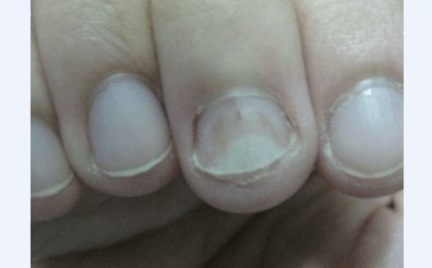 又名甲分离症,表现为甲板与甲床从游离缘处开始自动分离。通常为部分分离,甲不脱落。